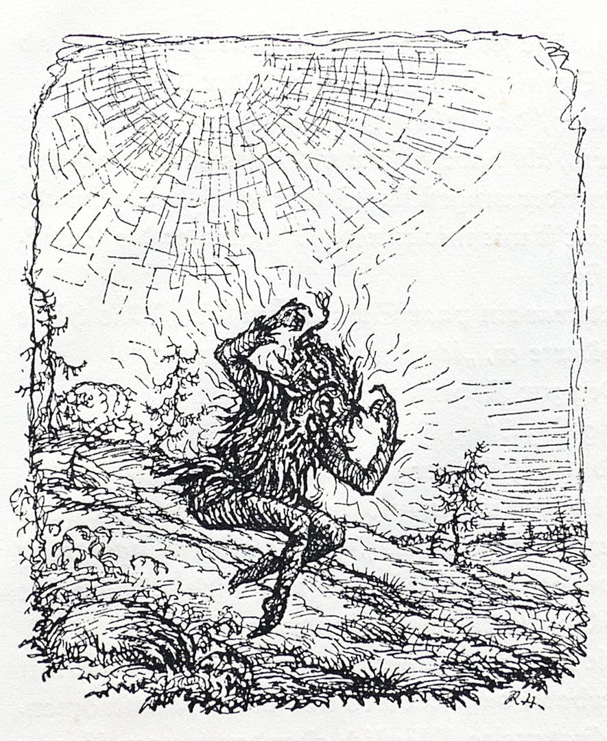 Auf einmal leuchtete es vom nahe gelegenen Erbachberg jenseits der heutigen Bahnlinie herunter. Ein Feuermann stand dort oben und brannte lichterloh „Komm her und leuchte mir“ rief der Fuhrmann, da stand der Feuermann auch schon neben ihm. Er half Stiefel und Lunne zu suchen. Dann suchten sie das Rad im hohen Gras, und durch sein helles Leuchten fanden sie es schnell. Er leuchtete dem Fuhrmann, bis alles wieder an seinem Platz war. Der Fuhrmann war aus seiner Not heraus, konnte den Weg weiterfahren und dankte dem Feuermann mit den Worten „der Herrgott mag dir deinen Lohn geben!“ Da antwortete der Feuermann „auf diese Worte warte ich schon Hunderte von Jahren!“ und flog schneeweiß zum Himmel; seine Seele war erlöst. Doch vom alten Fuhrmann erfuhr man, dass er nicht lange danach verstarb.